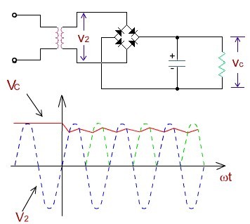 (1)電容濾波,所示在負(fù)載電阻上并聯(lián)了一個濾波電容C。電容是隔直通交,電壓不能突變。所以只能并聯(lián)在電路中,直流電從負(fù)載過,交流電就從電容過,從而達(dá)到濾波的目的。由于電容的儲能作用,使得輸出波形比較平滑。電容放電的時間τ=RLC越大,放電過程越慢,輸出電壓中脈動 (紋波:是主電流信號附帶的雜訊成分,小幅度交流電,無法完全隔絕,一般要求在主電壓的1%內(nèi)即可,如供電12V,那么要求電源的紋波不能大于120毫伏) 成分越少,濾波效果越好(電壓平滑)。
