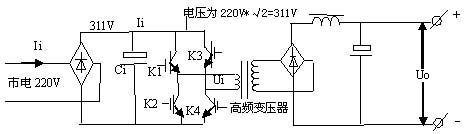 由電路可以看出,市電經(jīng)整流濾波后變?yōu)?11V高壓,經(jīng)K1~K4功率開關管有序工作后,變?yōu)槊}沖信號加至高頻變壓器的初級,脈沖的高度始終為311V。當K1,K4開通時,311V高壓電流經(jīng)K1正向流入主變壓器初級,經(jīng)K4流出,在變壓器初級形成一個正向脈沖,同理,當K2,K3開通時,311V高壓電流經(jīng)K3反向流入主變壓器初級,經(jīng)K2流出,在變壓器初級形成一個反向脈沖。這樣,在變壓器次級就形成一系列正反向脈沖,經(jīng)整流濾波后形成直流電壓。當輸出電壓Uo較高時,脈沖寬度就寬,當輸出電壓Uo較低時,脈沖寬度就窄,因此開關管實際上是一個控制脈沖寬窄的裝置。